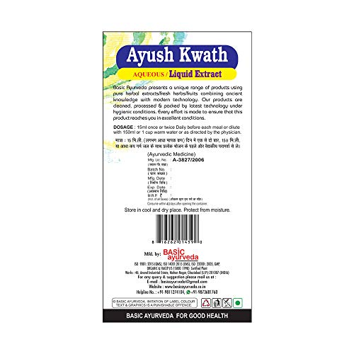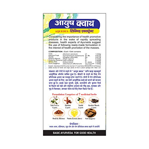 Basic Ayurveda Ayush Kwath liquid extract is an ayurvedic kadha that helps to boost immunity, fight infections, cough & colds, throat irritation, and improve respiratory functions.