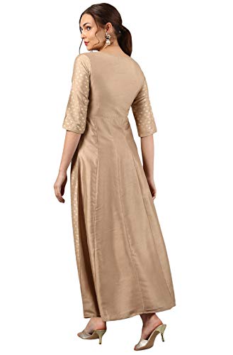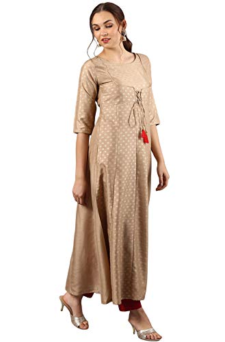 Unveil your refined stylish quotient by wearing this off white kurta from Janasya. Shaped from poly silk, it looks ravishing with anarkali silhouette and its tie-up design at yoke. The round neck and three quarter sleeves with gold print over-all adds to its appeal. Team it up with Chandelier Earrings and stilettos to stand-out from crowd.