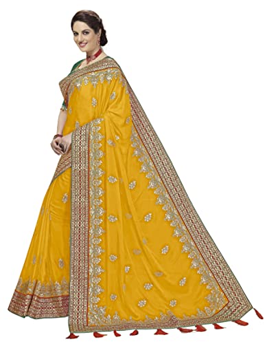Nivah Fashion Embroidery Saree for Women. This beautiful Sari design uses attractive color with Ethnic Design Embroidery Stone Work Saree with Designer Blouse. Indian traditional style ethnic saree made from Lemon Satin fabric and unstitched blouse piece Dupion Silk fabric which is similar to the shade and design of the saree. Women can wear this Embroidery Saree for wedding wear, marriage functions, and party festival occasion. Note: There might be little shade variation between the actual product and the image shown on the screen due to the photography effect.