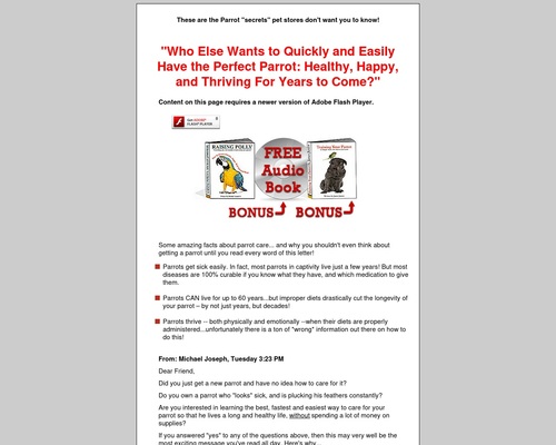 The Ultimate Guide to Raising Parrots! is backed with a 60 Day No Questions Asked Money Back Guarantee. If within the first 60 days of receipt you are not satisfied with Wake Up Lean™, you can request a refund by sending an email to the address given inside the product and we will immediately refund your entire purchase price, with no questions asked.